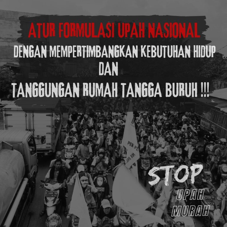 DKI Jakarta – Puluhan buruh lintas sektor industri dan wilayah yang tergabung dalam Komite Hidup Layak (KHL) menolak pemerintah menetapkan Upah Minimum Provinsi (UMP) dan Upah Minimum Kabupaten/Kota (UMK) berdasarkan Peraturan Pemerintah (PP) Nomor 51 Tahun 2023, Senin 27 November 2023. Formulasi penghitungan upah minimum dalam beleid anyar tersebut, tidak mempertimbangkan pengeluaran riil buruh, di antaranya kebutuhan rumah tangga dan tanggungan buruh. Komite Hidup Layak pun menuntut kenaikan upah berdasarkan hidup layak, menuntut pemerintah menjamin tidak terjadi PHK setelah kenaikan upah minimum, menurunkan harga Sembako dan menurunkan harga BBM.